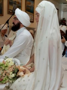 The first year (summer of 97) that we studied with Bhai Baldeep Singh, he used some colorful language. One day some people sitting in the class heard us singing a newly composed rag bhairo exercise, “we are bloody fools”, and chose to take offense. For Americans the word “bloody” doesn’t carry the weight of profanity that it might for English people, so there was a group of women that chose not to take offense. Those of us that were familiar with the language of Siri Guru Granth Sahib recognized the underlying sentiment. If the Guru himself can say “I am a fool” why can’t we? Ever since then we have lovingly remembered ourselves as “The Bloody Fools”. This month on April 1st, the group met at Guru Ram Das Ashram in Los Angeles to sing at the wedding of one of our daughters. After the wedding the mother of the bride realized the Bloody Fools had met to sing on April Fools Day! The wedding was a beautiful celebration of life and love. The glowing couple, eager to begin their new lives together, was surrounded by family, friends and flowers. Because there were family members who are unfamiliar with Sikh knowledge and practices, we sang a few songs with guitar, western harmonies and bani translated into English. The wedding ceremony began with a hukam that evoked the image of the righteous bride meeting her Lord with ease and it felt like a blessing.