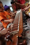 Then you may notice the sound of voices singing and if you follow the music down the stairs you will find yourself in a room filled with men and women, Punjabis, Europeans, Americans and Canadians, young and old, singing along with tanpura, taus, pakhawaj and rabab. Electric cables are everywhere and a photo would make a good advertisement for Apple because nearly everyone is using an iPod or laptop to record the day’s singing class and the sound of tanpura is resonating from an app on several iPads and iPhones. In the front of the class there is a whiteboard charting the notation for the vocal exercise in practice. Bhai Baldeep Singh sits at the front of the room singing along or offering instruction. Sometimes the music stops and the teacher begins a new series of exercises, or talks on a relevant topic, often accompanied by plenty of laughter. When the singing shifts to the singing of shabds the little sangat really comes alive. Learning from the repertoire of an oral tradition that extends from the Guru times, the students drink the bani nectar.