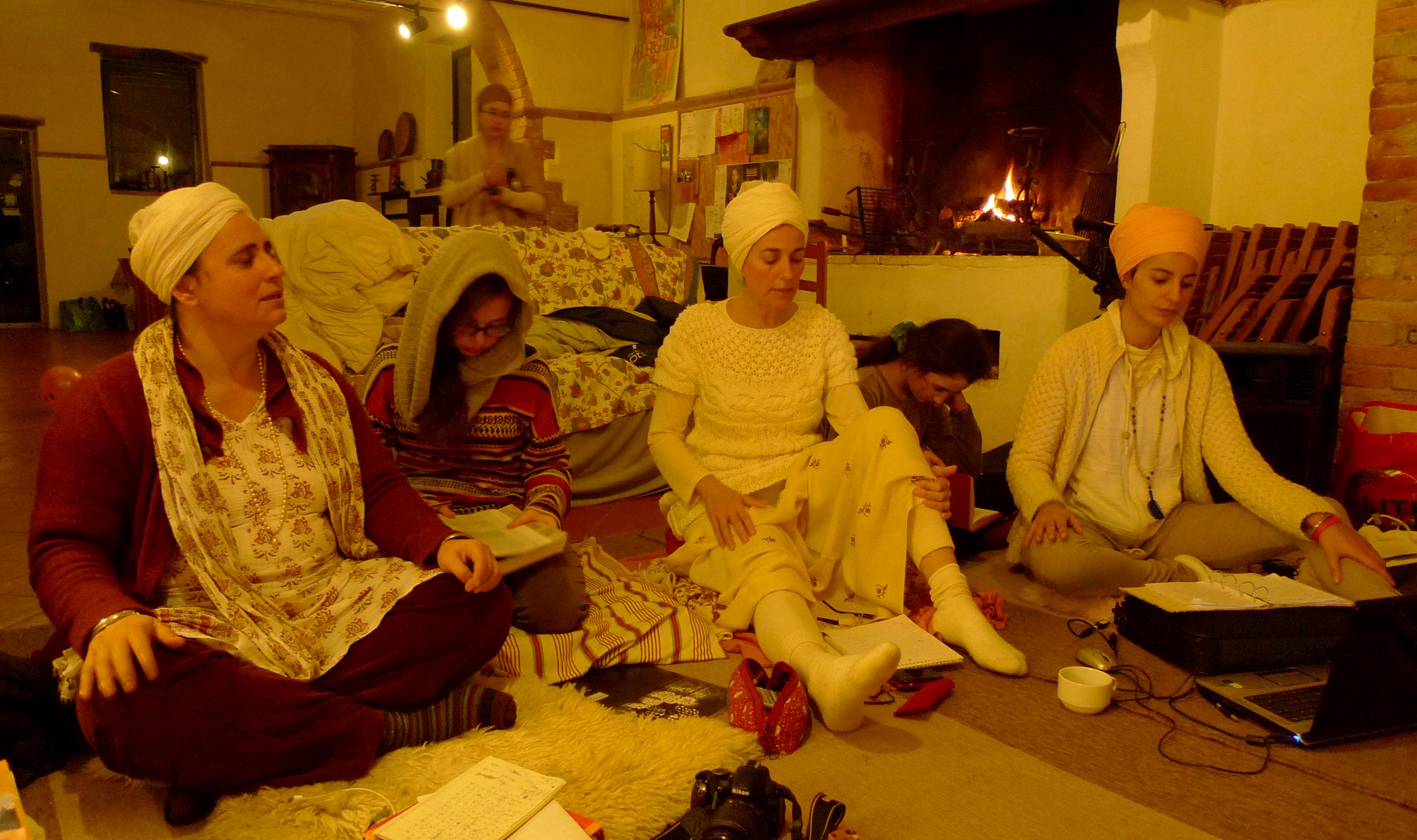 Class II – Dr. Francesca Cassio (Hofstra University, NY), Jasbir Singh (Chandigarh), Siri Sevak Kaur (Millis, Massachusetts) and Luigi practicing.