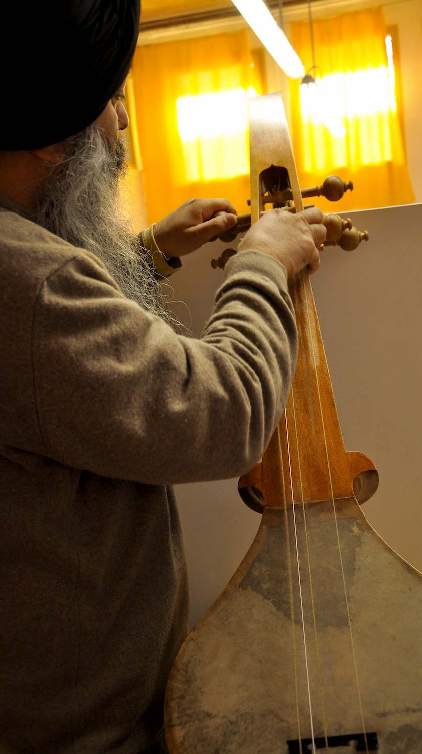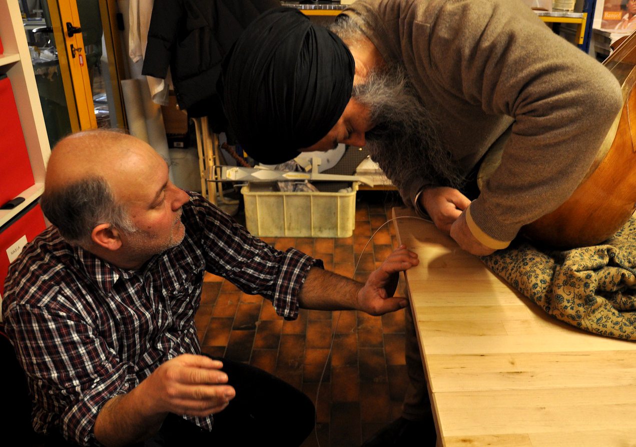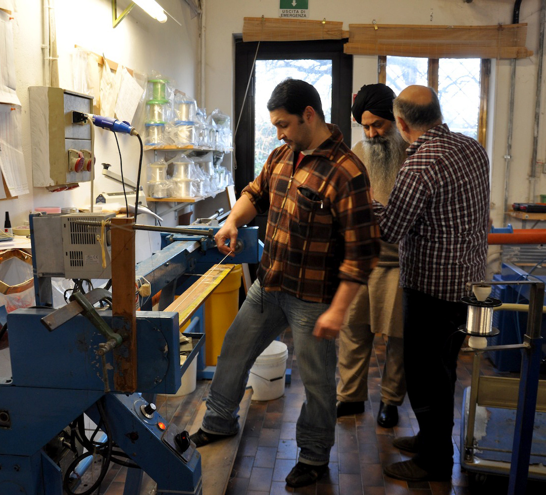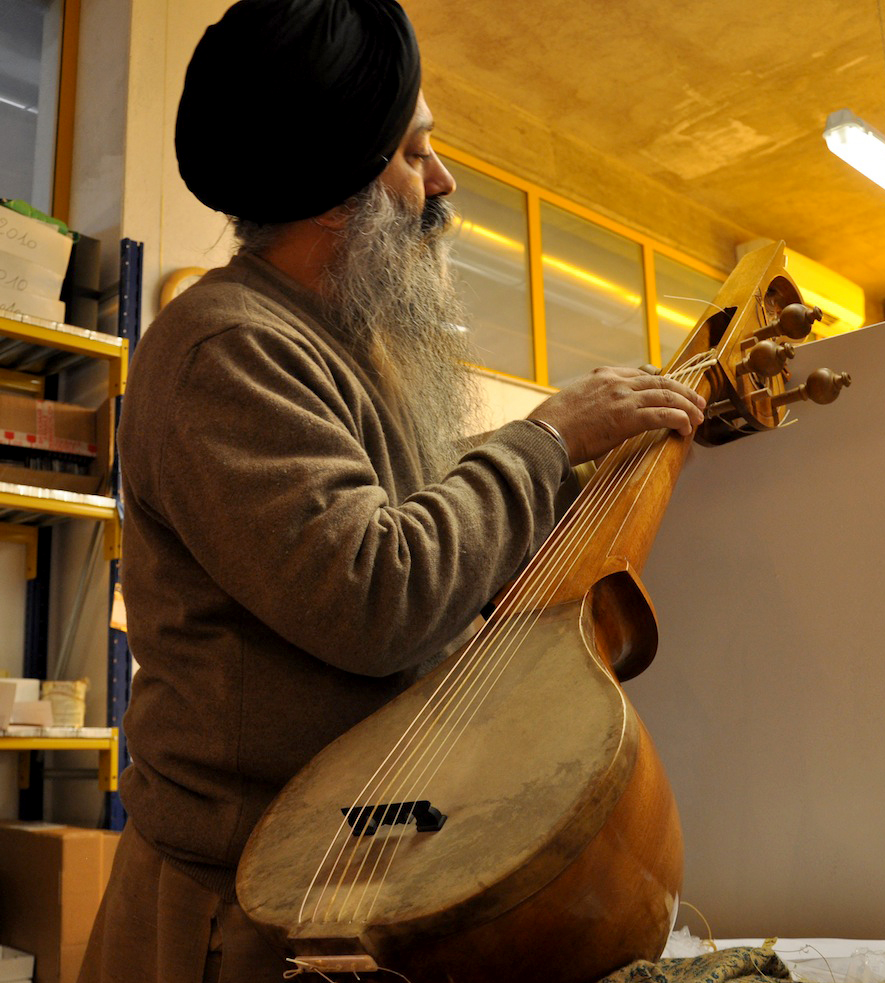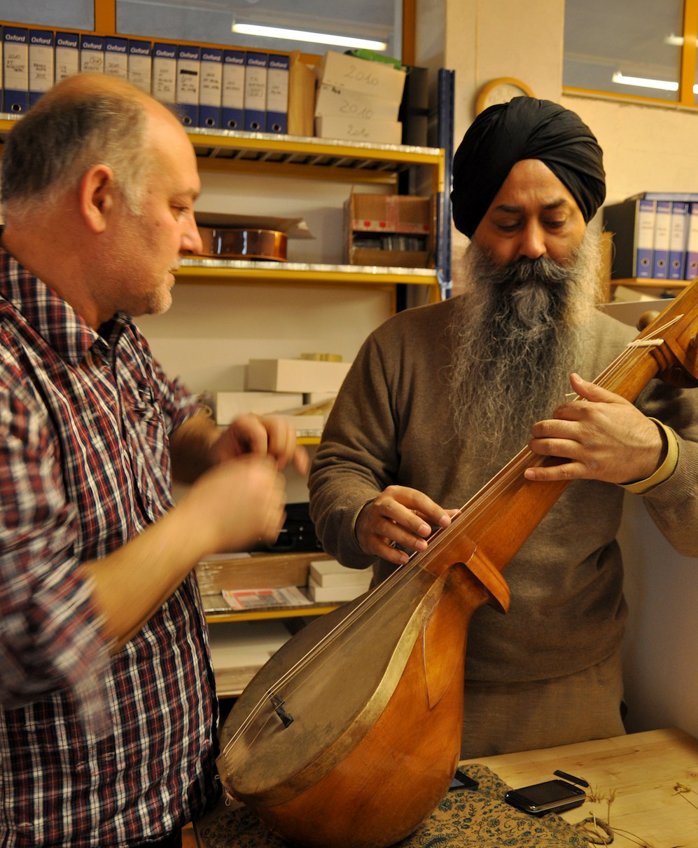 On Wednesday, January 23, 2013, I drove from Florence to Vicenza to meet again with master Gut-string maker, Mimmo Peruffo. I had visited him in June as well when we had calculated and identified the strings for the Rabab made on the specifications of Guru Arjan Dev Ji’s 16th century Rabab. I had made pair of those, one of which was made for my student, Harbhajan Kaur of Millis, MA, while the other, which is yet to be varnished, will be in the collection of Anad Foundation and most probably played by Luigi Hari Tehel Singh. The Rabab I carried with me was the replica of the late 17th century Rabab of Ustad Basat Khan, which was in the collection of the legendary Sarod player, Radhika Mohan Moitra. This collection is being cared for by his youngest disciple, Somjit Dasgupta, who was also featured in the first ever publication (2005) of the Dhrupadi or Hindustani Rabab published by Anad Records Pvt. Ltd.