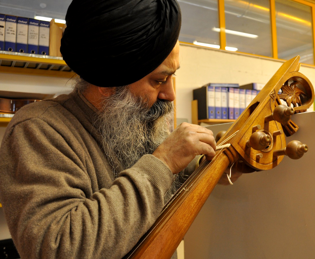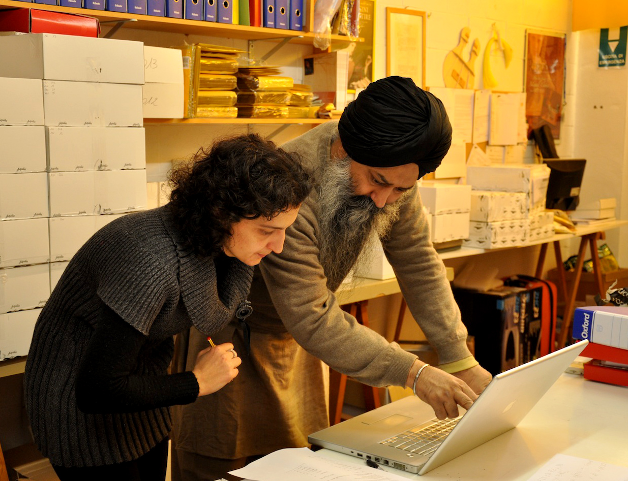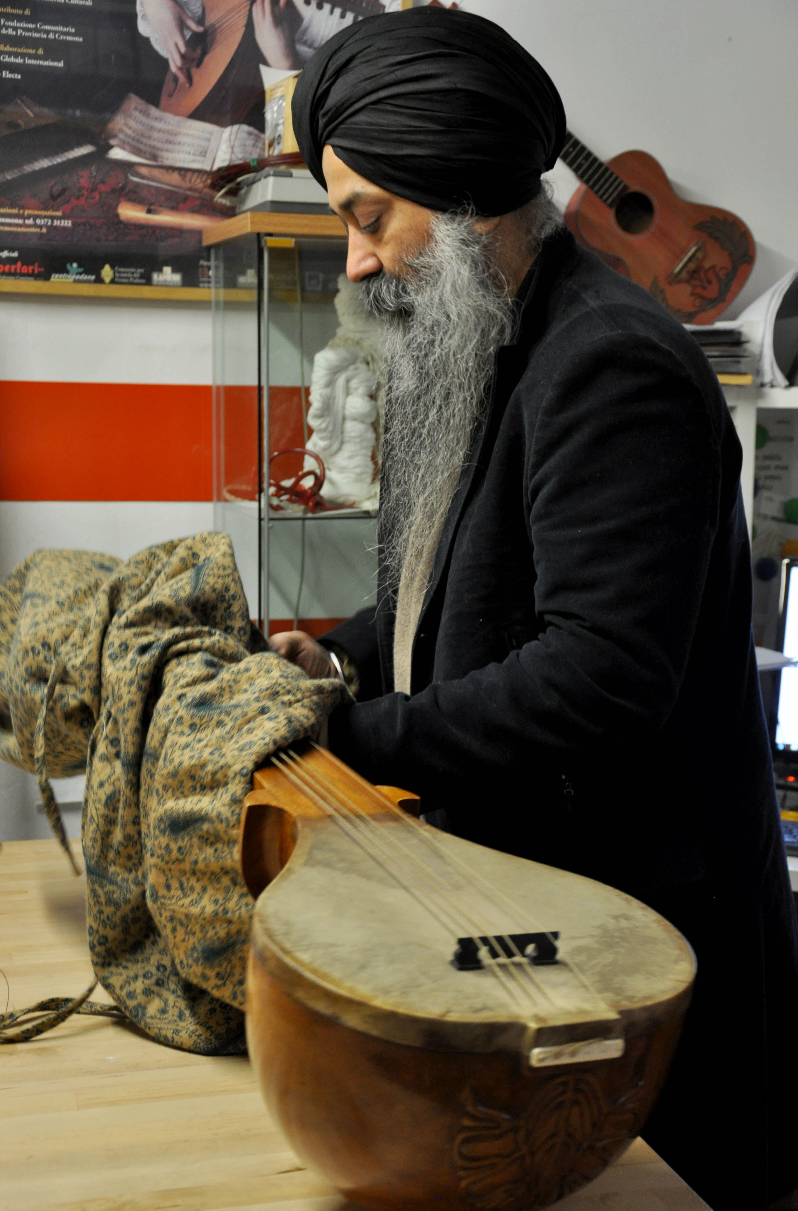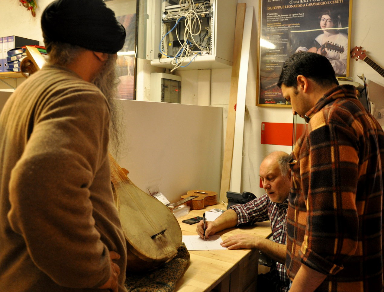On Wednesday, January 23, 2013, I drove from Florence to Vicenza to meet again with master Gut-string maker, Mimmo Peruffo. I had visited him in June as well when we had calculated and identified the strings for the Rabab made on the specifications of Guru Arjan Dev Ji’s 16th century Rabab. I had made pair of those, one of which was made for my student, Harbhajan Kaur of Millis, MA, while the other, which is yet to be varnished, will be in the collection of Anad Foundation and most probably played by Luigi Hari Tehel Singh. The Rabab I carried with me was the replica of the late 17th century Rabab of Ustad Basat Khan, which was in the collection of the legendary Sarod player, Radhika Mohan Moitra. This collection is being cared for by his youngest disciple, Somjit Dasgupta, who was also featured in the first ever publication (2005) of the Dhrupadi or Hindustani Rabab published by Anad Records Pvt. Ltd.