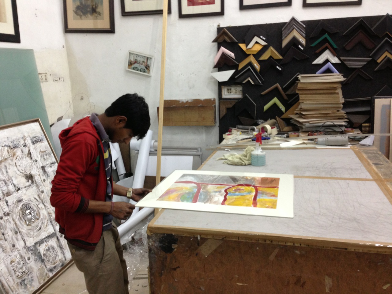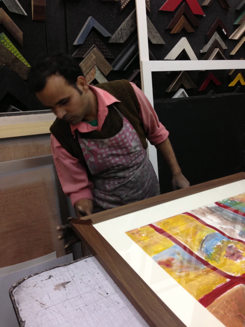 Yesterday afternoon, that is on Monday, February 11, 2013, I went to Sharma Framing House and requested Sujit, the younger brother of Hari Lal, to do a sample frame with an off-white mount. The traffic was much and I remembered Pasquale, a brother-in-law, teaching me in the summer of 1995 to exclaim “Ma, che traffico!” in Napolitan when caught in such a situation. You can try it as well but the traffic remains. At about 7p, I walked to the waiting car and drove with a brownish frame clad Raga Vadhan painting as the difference showed – aesthetically and weight-wise. The glass was a mere 2mm instead of the 4mm they used in Sultanpur Lodhi. The Italian wood used nowadays by Sharma Framing is very light in comparison to the Kail wood used by the local carpenter, which was much heavier also for it yet retains much moisture. Expect the Kail wood frames to warp this summer. I thought, as I waited for my turn to pass the traffic lights at Ashram Chownk, to try and securely pack the Kail frames in fives to limit their warping. Once home, I got to confer with Maurizia, with Paolo Pacciola and his danseuse wife, Luisa Spagna, joining in with their suggestions. They all voted for the new frames, but they aren’t cheap.