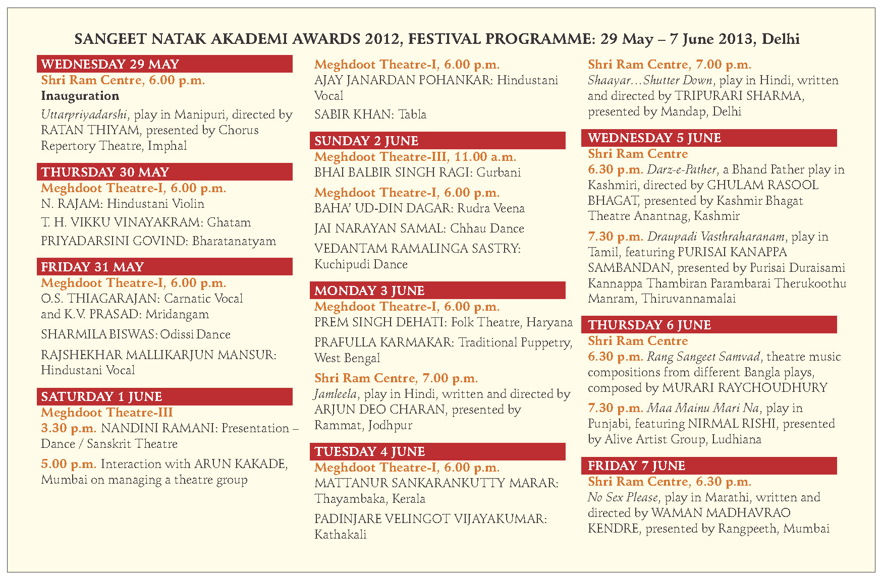 National Akademi of Music, Dance & Drama Awards Programme 21 Tuesday May 2013 Posted by Anad Foundation in ANAD Discussion Forum, People, Press ≈ Leave a comment The Sangeet Natak Akademi awards will be conferred by the Honorable President of India, Sri Pranab Mukherjee, on May 28, 2013, followed by the performances of the awardees. Share this: Click to share on X (Opens in new window) X Click to share on Facebook (Opens in new window) Facebook Like Loading...