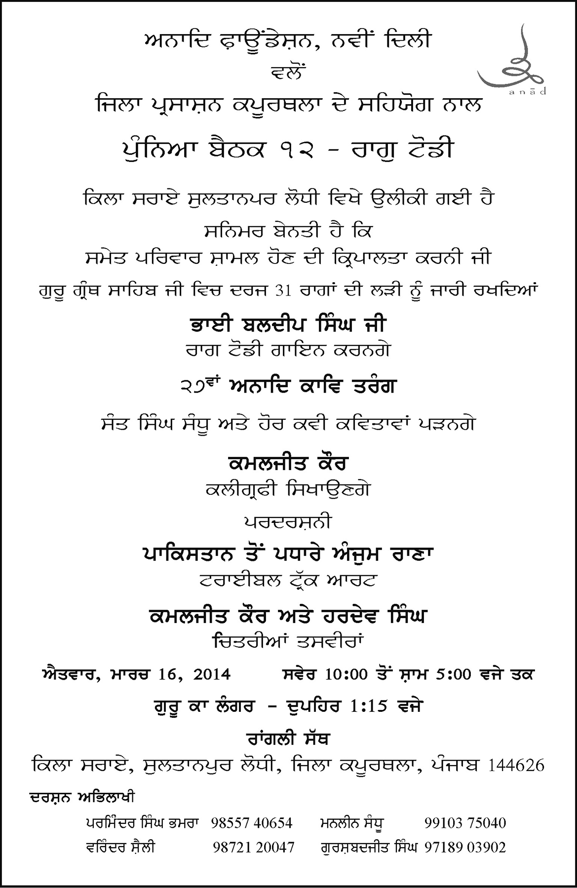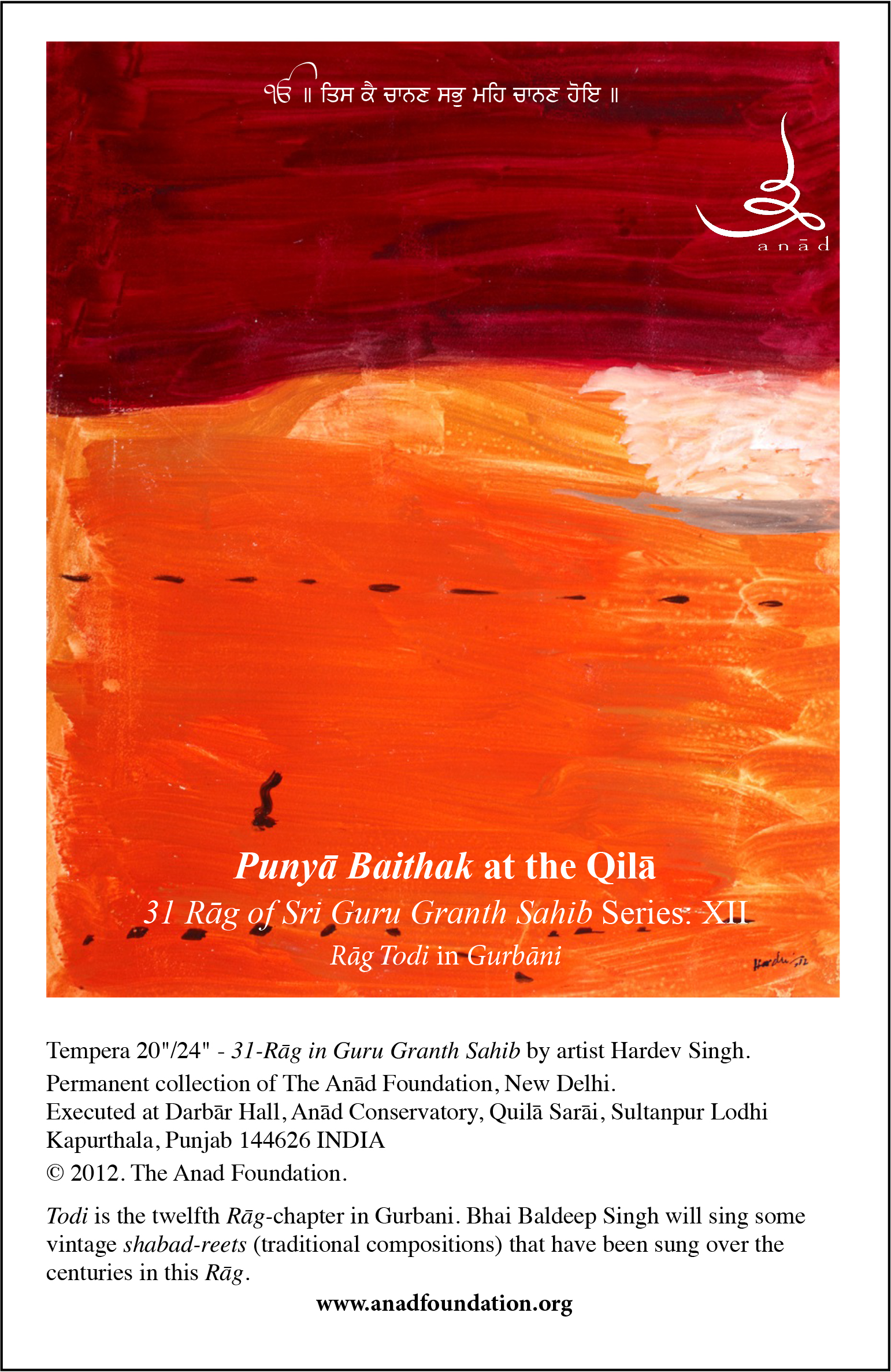 Punyā Baithak at the Qilā – 31 Rāg of Sri Guru Granth Sahib Series: XII Raga Todi 09 Sunday Mar 2014 Posted by Anad Foundation in ANAD Events, ANAD Foundation, ANAD Khand ≈ Leave a comment Please spread the word and join us all!!! Share this: Click to share on X (Opens in new window) X Click to share on Facebook (Opens in new window) Facebook Like Loading...