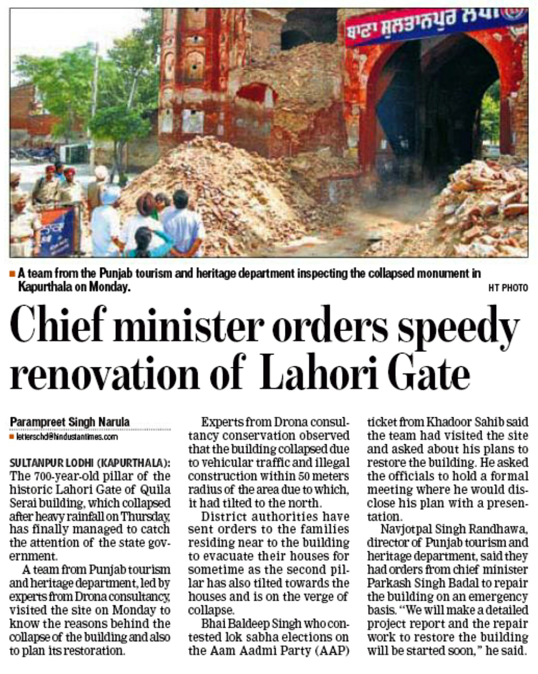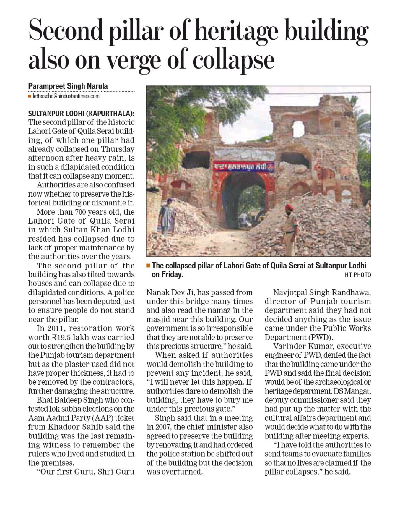1 thought on “Lahore Gate of Qila Sultanpur Lodhi Falls I – Reports by Parampreet Singh Narula (Hindustan Times)”