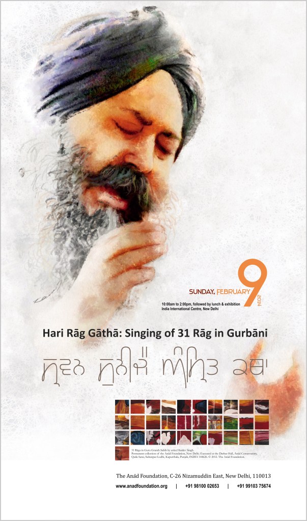 On February 9, 2014, The Anād Foundation will host a concert unprecedented in the history of performance in the nation’s capital: a singing of 31 rāga in gurbāṇī in one six-hour-long concert. Bhai Baldeep Singh, a 13thgeneration exponent of gurbāṇī kīrtan and Chairman of The Anād Foundation, will perform all 31 rāga in the Guru Granth Sahib. Choosing from a wide variety of ancient repertoire hitherto rarely learned or rendered by practitioners of gurbāṇī kirtan in the 21st century, Bhai Baldeep Singh will sing a variety of dhrupad and chantt based compositions. The first concert in this series by Bhai Baldeep Singh was performed at Guru Nanak Dev University in Amritsar in September 2013. It was accompanied by an exhibit of luthiery tools and musical instruments used in kirtan during the gurus’ times, revived after being nearly extinct and fallen from use in gurbani kirtan for over 150 years. For the last 25 years, Bhai Baldeep Singh has been on a journey to not only imbibe gurbani sangeet repertoire from the gurus’ times, when his ancestors, renowned kirtan practitioners themselves, served as close companions and advisors of the gurus but also personally handcraft instruments from the gurus’ court back to life.