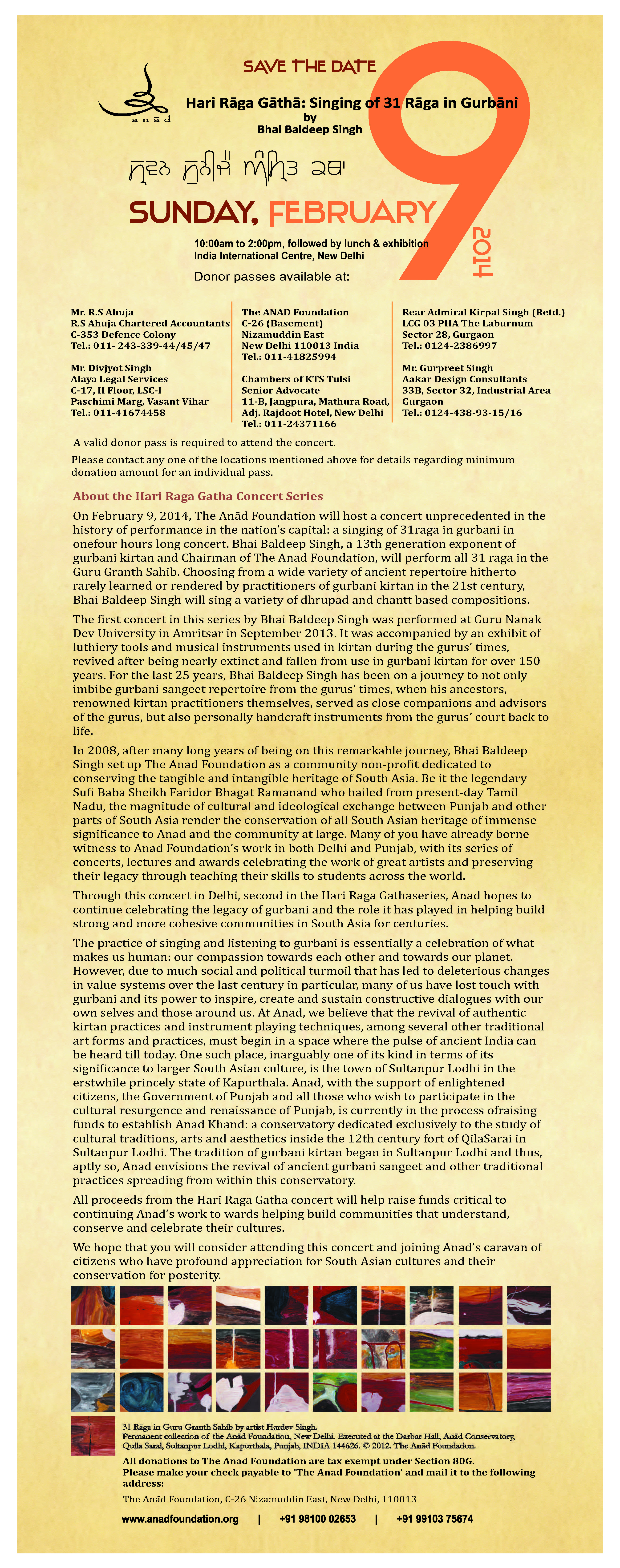 On February 9, 2014, The Anād Foundation will host a concert unprecedented in the history of performance in the nation’s capital: a singing of 31 rāga in gurbāṇī in one six-hour-long concert. Bhai Baldeep Singh, a 13thgeneration exponent of gurbāṇī kīrtan and Chairman of The Anād Foundation, will perform all 31 rāga in the Guru Granth Sahib. Choosing from a wide variety of ancient repertoire hitherto rarely learned or rendered by practitioners of gurbāṇī kirtan in the 21st century, Bhai Baldeep Singh will sing a variety of dhrupad and chantt based compositions. The first concert in this series by Bhai Baldeep Singh was performed at Guru Nanak Dev University in Amritsar in September 2013. It was accompanied by an exhibit of luthiery tools and musical instruments used in kirtan during the gurus’ times, revived after being nearly extinct and fallen from use in gurbani kirtan for over 150 years. For the last 25 years, Bhai Baldeep Singh has been on a journey to not only imbibe gurbani sangeet repertoire from the gurus’ times, when his ancestors, renowned kirtan practitioners themselves, served as close companions and advisors of the gurus but also personally handcraft instruments from the gurus’ court back to life.