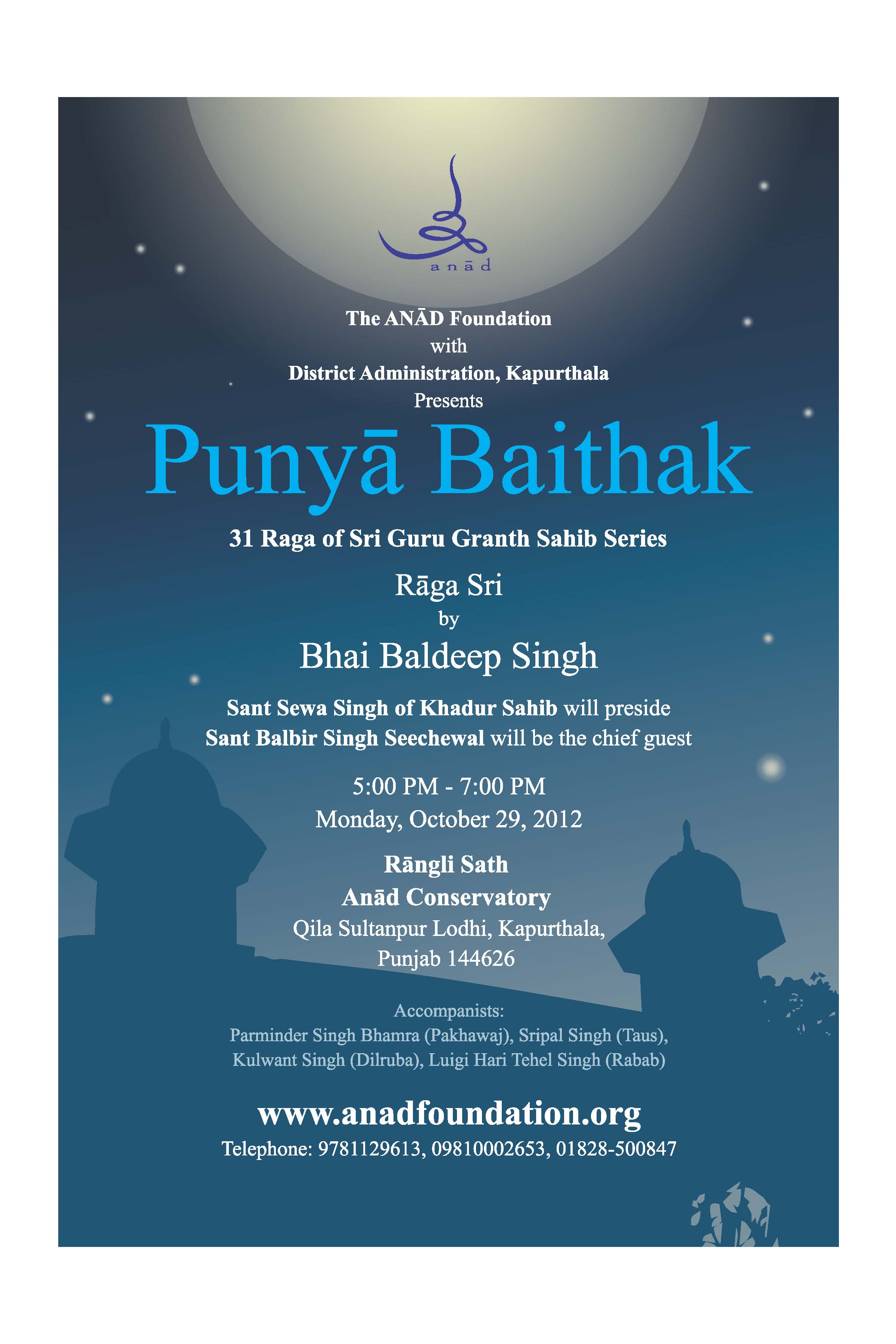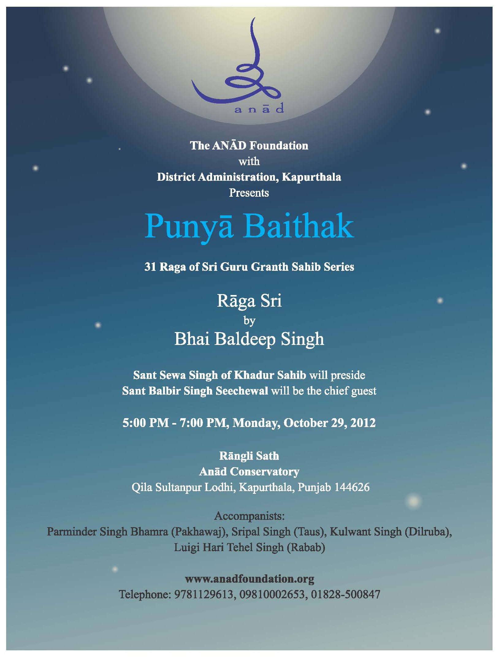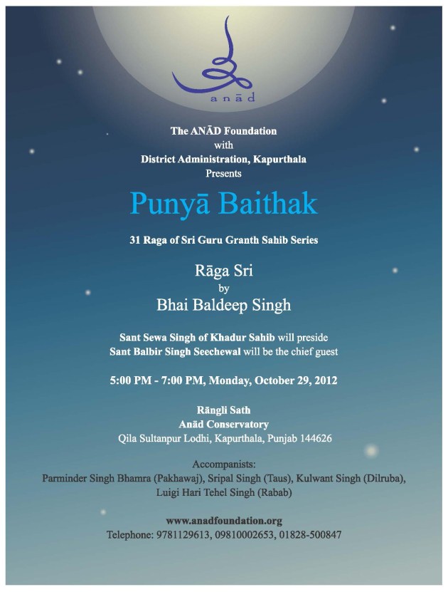 These songs in 31 rāgas convey the body of teachings of gurus and saints. Over the next three years, Bhai Baldeep Singh, will present a series of 31 full-moon programs, a journey through each of the 31 rāgas of Siri Guru Granth Sahib. The series begins Monday, October 29 with selected songs from the first rāga, Sri Rāga.